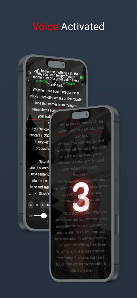 What sets Promptly Pro apart is its intelligent suite of automation tools tailored for solo creators and studio setups alike. Our revolutionary Voice Activated Scrolling uses advanced speech recognition to follow your natural pace—pausing when you improvise and resuming the moment you return to the script. For those using external hardware, the app offers comprehensive Mirror Text and Video modes, allowing you to flip your script for professional beam splitter glass or record yourself directly within the app with a seamless overlay. From hands-free auto-scrolling to professional rig compatibility, Promptly Pro is the only tool you need to deliver flawless, one-take performances.