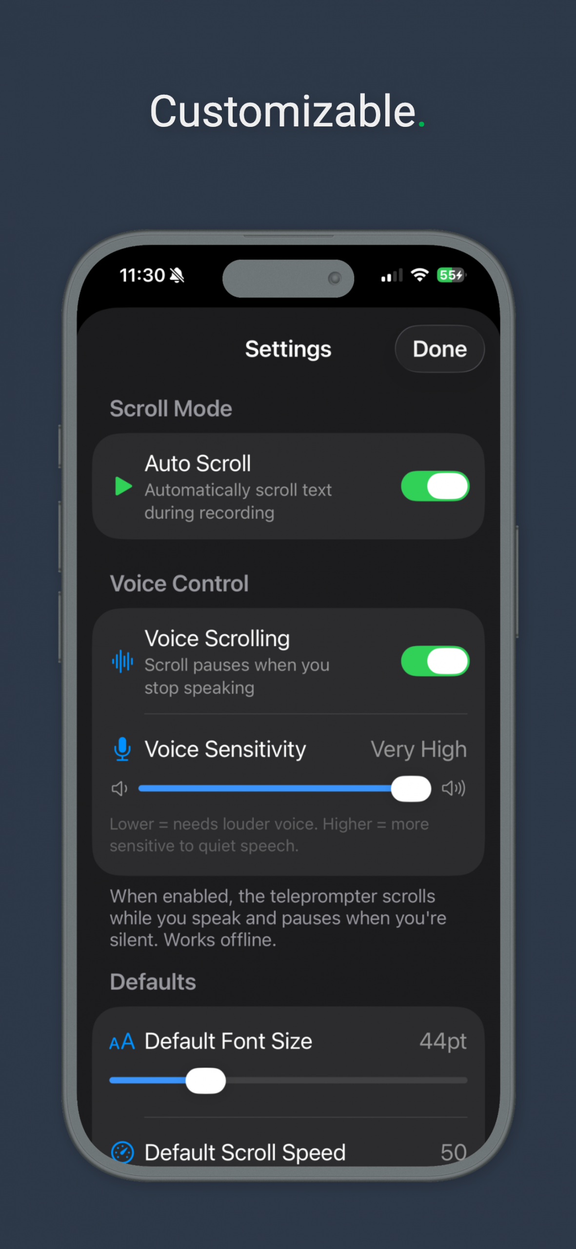 Configure your settings to suit your requirements, including camera opacity, font speed and scroll speed.